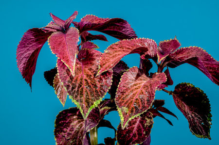 Beautiful Blooming Coleus Chocolate Covered Cherry on a blue background. Flower head close-up.