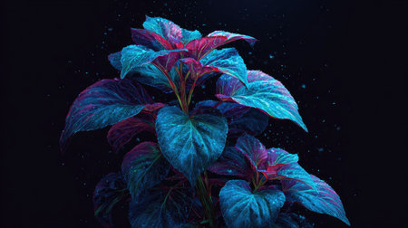 A close-up studio shot presents a lush plant with striking blue and purple leaves. The leaves exhibit a textured appearance, illuminated against a deep black backdrop. The image utilizes dramatic lighting, highlighting the plant's form. This versatile image suits various commercial applications, emphasizing nature and botanical themes.