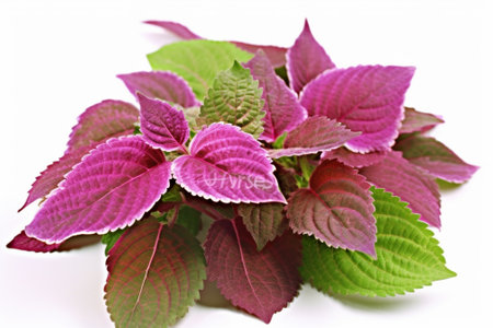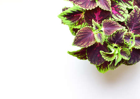 Coleus scutellarioides houseplants, with striking colors and shapes. White background and copy space.