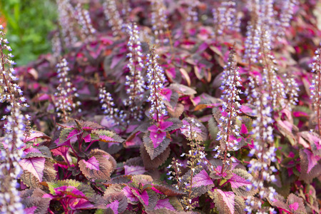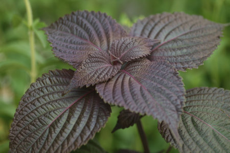 Perilla plant close up on flower bed, growing in Russian far east