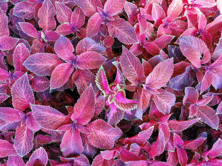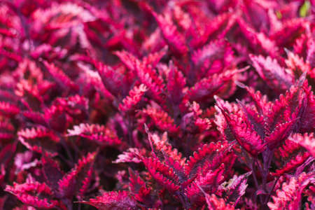 Close up of a red coleus solenostemon hybrida leaves background in a garden