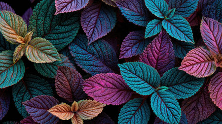 Colorful leaves background. Purple and blue color leaves pattern. Nature background.
