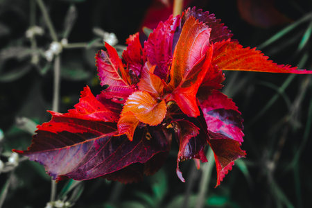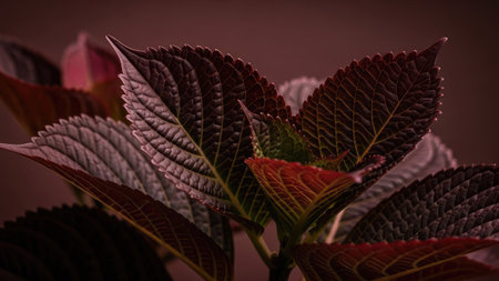 Bright redhead coleus. Plectranthus scutellarioides. Abstract red leaf texture background. Dark art moody floral. Vinous nature decor for presentation of natural cosmetics or wallpaper desktop