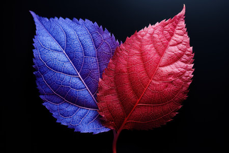 Close-up of two red and blue leaves on black background.