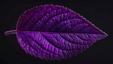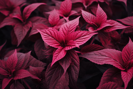 This breathtaking image captures the mesmerizing beauty of vibrant fuchsia leaves set against a dark moody backdrop The intricate textures and patterns of the lush organic foliage are showcased in