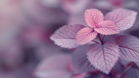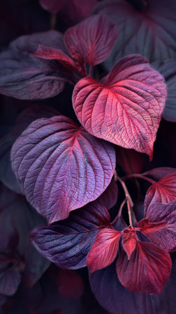 Beautiful close-up of lush leaves displaying rich purple and red hues, showing intricate textures and patterns in a natural setting during spring.