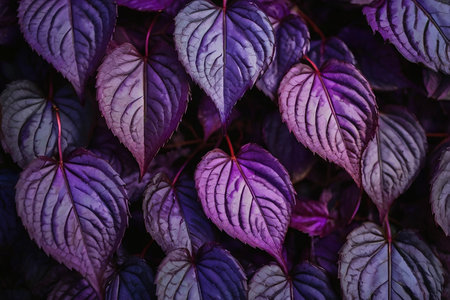 Perilla frutescens leaves close up as a beautiful nature background. Organic food ingredient. selective focus. Color of the year 2023 inspired