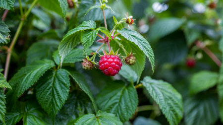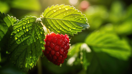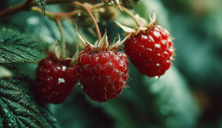Ripe red raspberries are nestled among green leaves, glistening with dew, highlighting their freshness and natural beauty in a vibrant garden environment
