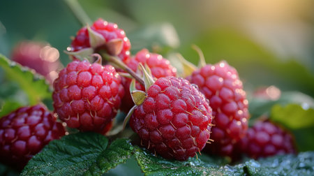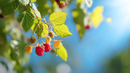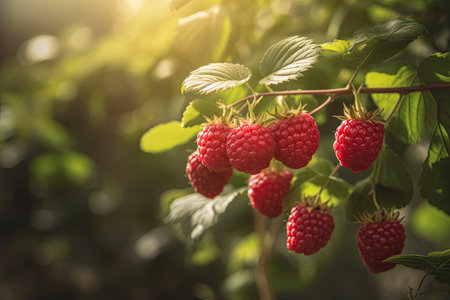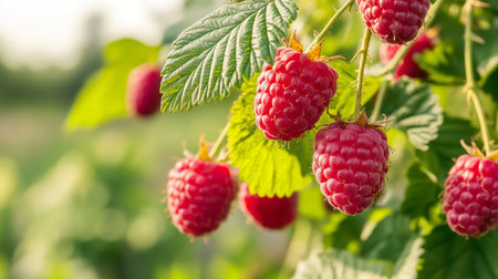 This vibrant image showcases fresh ripe red raspberries growing on a branch surrounded by green leaves, illuminated by bright sunlight, capturing the essence of summer.