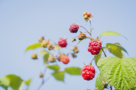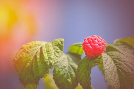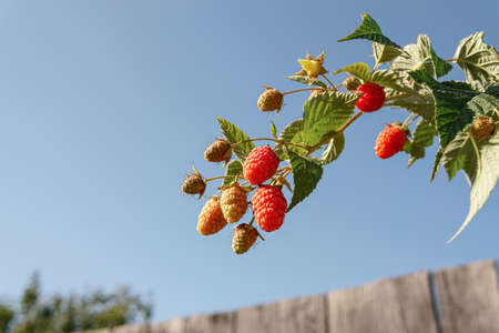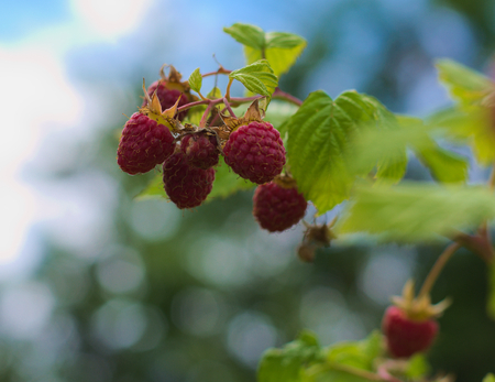 Red ripe raspberries the garden on blue sky, green leaves on a branch.