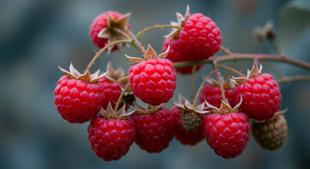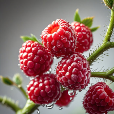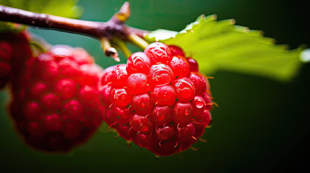 A closeup of dewkissed raspberries hanging from a branch, highlighting the freshness and natural appeal of the fruit