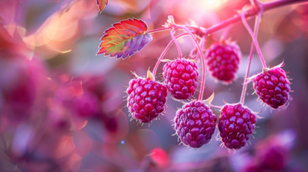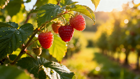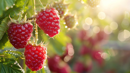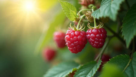 Juicy raspberries hang from green branches, illuminated by warm sunlight. The background features a soft bokeh effect, creating a serene summer atmosphere, perfect for fruit picking.