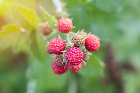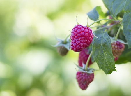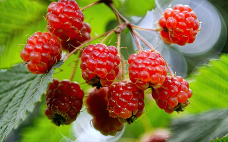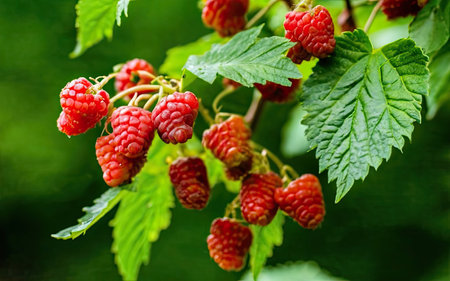 Ripe raspberries hanging from green leaves in a sunny outdoor garden during the summer