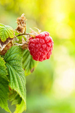 Raspberry berry in the garden, close-up. Ripe red berry, summer harvest