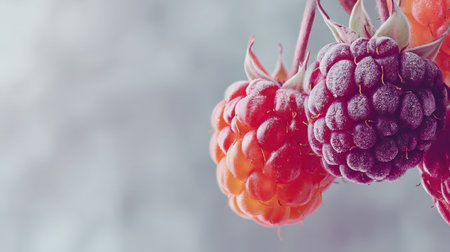 This stunning image features fresh raspberries in rich red and purple hues, captured in soft natural light, ideal for food, health, and culinary themes.