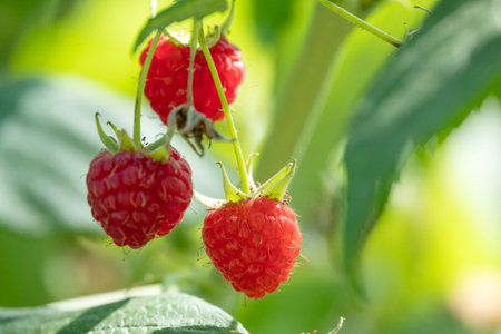 Ripe red raspberries on branch in sunlit garden, healthy organic fruit, free copy space