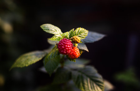 Close-up of ripe rasberries on the vine, ready for harvesting.