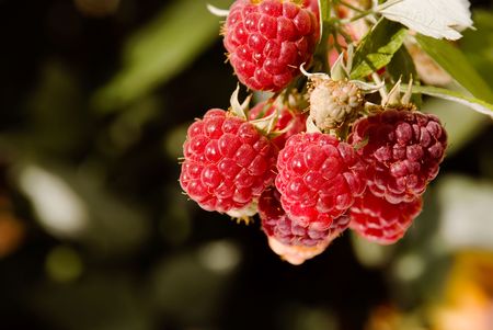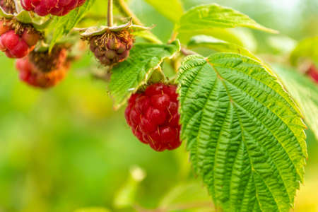 Raspberries branch garden. Raspberries in the sun. Red berry with green leaves in the sun. Photo of ripe raspberries branch.