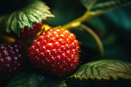 This close-up view captures a raspberry bush adorned with both ripe and unripe berries, highlighting the rich contrast in color and intricate textures of the leaves and fruit.