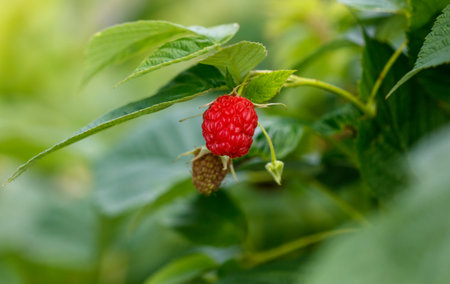 The close-up view showcases a raspberry bush adorned with clusters of ripe, red berries alongside unripe green berries, highlighting nature's textures and contrasts.
