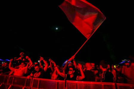 Brezje, Croatia - 20th July, 2019 : Audience with flag dancing during the Forestland, ultimate forest electronic music festival located in Brezje, Croatia.