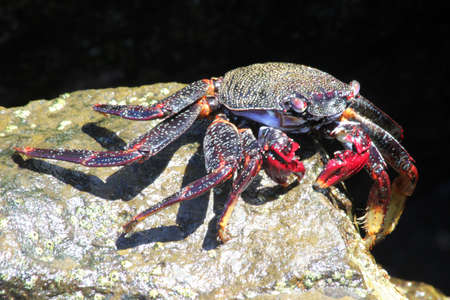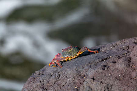 Isolated Grapsus Albolineatus crab on a wet lava rock on the sea shore close-up photo.