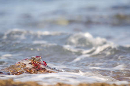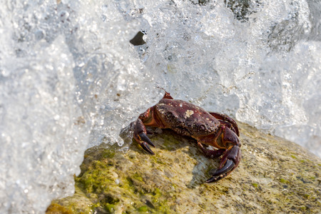 Crab Grapsus adscensionis bathed by a wave. Sardina del Norte. Galdar. Gran Canaria. Canary Islands. Spain.