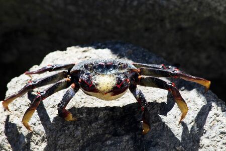 Red crab with white spots among the rocks on Las Canteras beach, in Las Palmas, Spain. Animal concept
