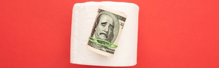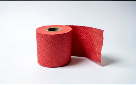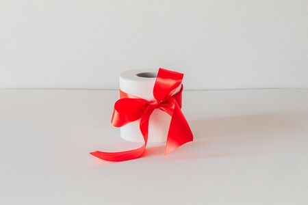 Toilet paper on a red background with copy space. White paper product used for sanitary purposes. Top view, flat lay