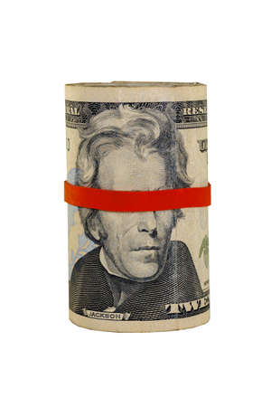 $20 American dollar bills rolled up and held together with a red rubber band covering Andrew Jackson’s eyes. Isolated on white background.