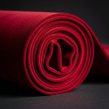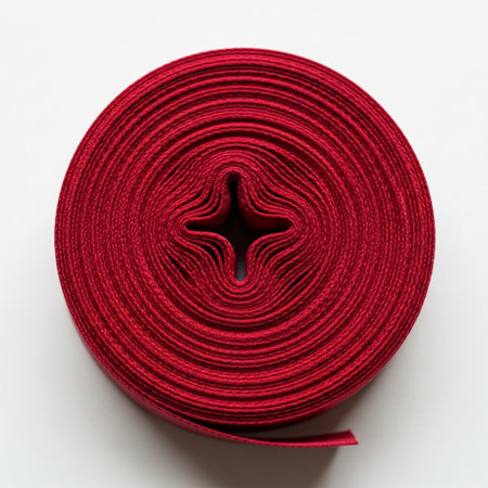 A red roll of fabric is being fed through a machine. The machine is blue and has a blue handle