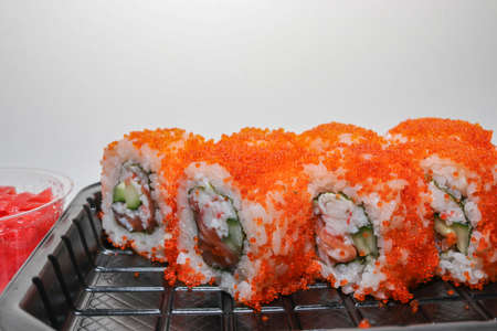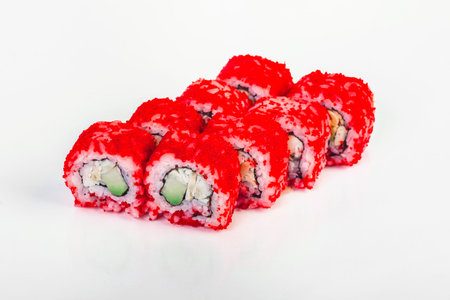 Sushi roll with avocado and shrimp in red caviar on white background isolated