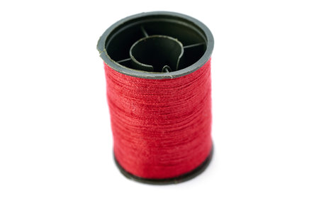 Eye of the needle with red polyester thread. Spool of red polyester sewing thread in the background. selective focus. bokeh.