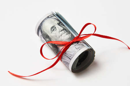100 dollar bills on a roll isolated on white background. Rolled up money isolated on white background. Dollars isolated on white background. Dollar roll wrapped with red ribbon.