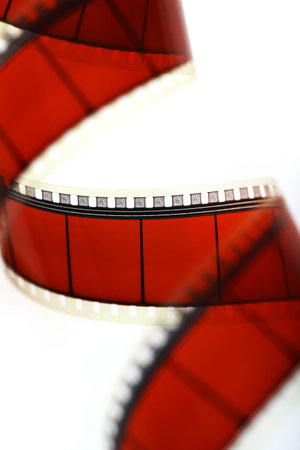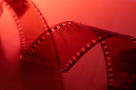 35mm negative photographic film in rotation in red room, camera darkroom. Slightly rolled film strip isolated on red background. Analog film strips