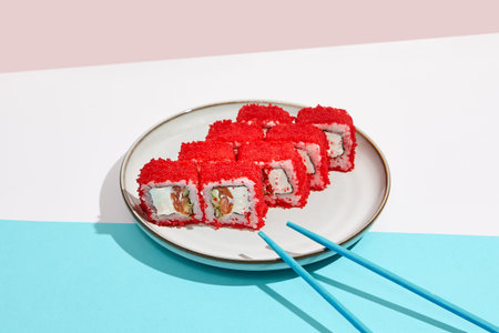 California maki roll with tobiko caviar on modern colored background. Sushi roll with salmon and cucumber inside, tobiko caviar outside. Colorful maki sushi in minimal style. Japanese menu concept