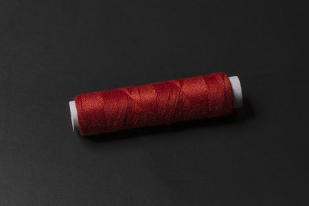A coral spool of threads on coral paper background, with copy space. Coral color