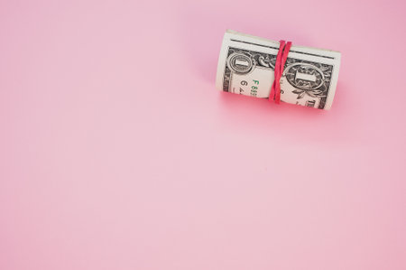 A closeup of a roll of dollars isolated on pink background for a copy space