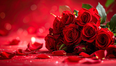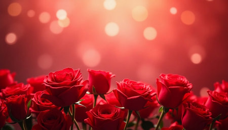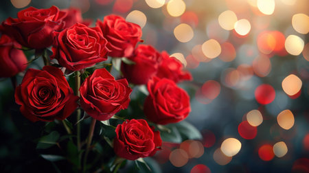 Lush red roses bloom passionately, velvety petals catching delicate glimmer of bokeh lights. Enchanting arrangement mesmerizing atmosphere love admiration. A blank space invites heartfelt messages AI