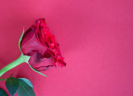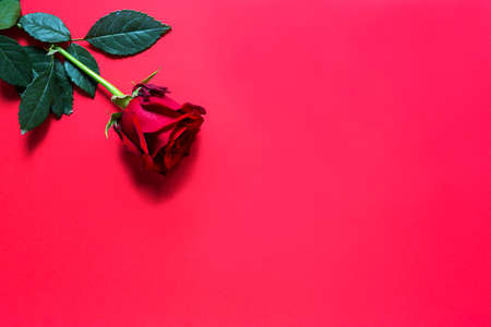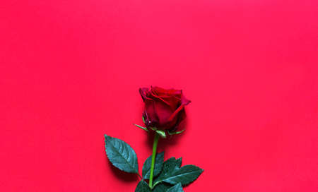 Red rose on red background with copyspace. A gift for a woman on a holiday, an invitation to a date, Valentine's Day, a sign of love