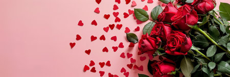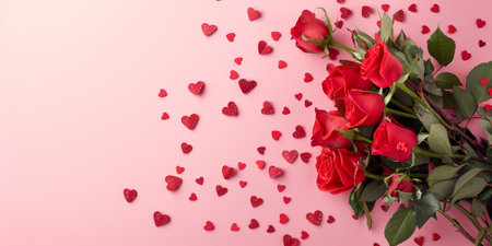 A beautiful bouquet of vibrant red roses elegantly surrounded by heartshaped petals on a soft pink backdrop