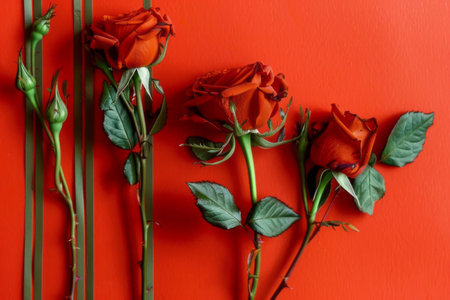 Beautiful red roses arranged elegantly on a matching red background, creating a romantic and striking floral display.