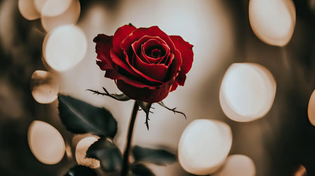 A stunning close-up of a single red rose with delicate petals and vibrant color, elegantly set against a backdrop of soft glowing lights, creating a romantic ambiance.