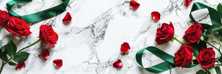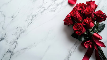 A stunning bouquet of elegant red roses rests on a smooth marble surface, complete with lush green leaves and a delicate ribbon bow, symbolizing love and beauty.