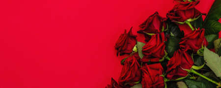 Bouquet of fresh burgundy roses on a matte red foamiran background. Fragrant red flowers, gift concept for Valentine's Day, Wedding or Birthday, top view, banner format