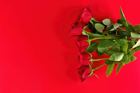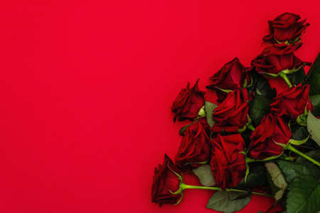 Bouquet of red roses on a red background with copy space