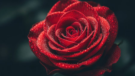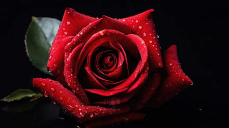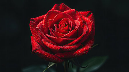 A striking close-up showcases a radiant red rose, its petals meticulously arranged. The image emphasizes the flower's texture and color against a deep black backdrop, creating a dramatic contrast. Suitable for various applications, including design projects, presentations, and marketing materials seeking botanical elegance.