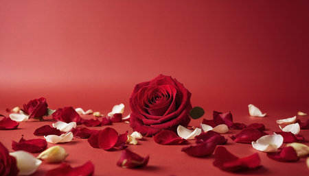 Red rose and petals on red background. Valentines day concept