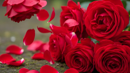 A close-up image of vibrant red roses with delicate petals gently falling onto a moss-covered stone surface, creating a romantic and serene atmosphere.