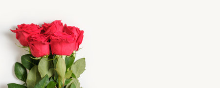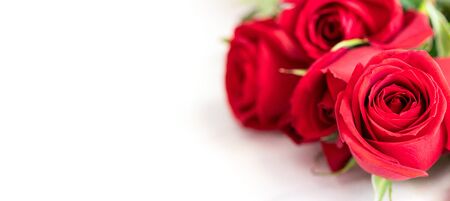 A bouquet of red roses on a white background. Blooming flowers, festive concept for Mother's Day or Valentine's Day. Greeting card, Easter flat lay, best wishes, banner format